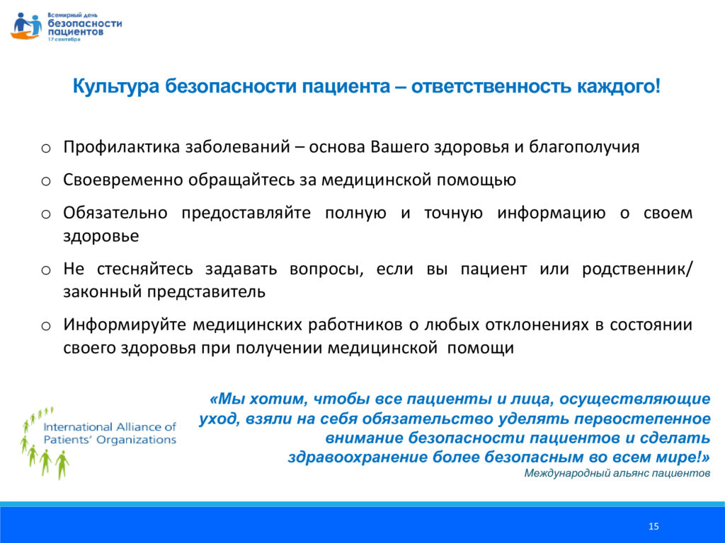 17 сентября 2022 г. Министерством здравоохранения России совместно с Федеральной службой по надзору в сфере здравоохранения в России запланированы мероприятия, посвященные Всемирному дню безопасности пациентов в 2022 году.