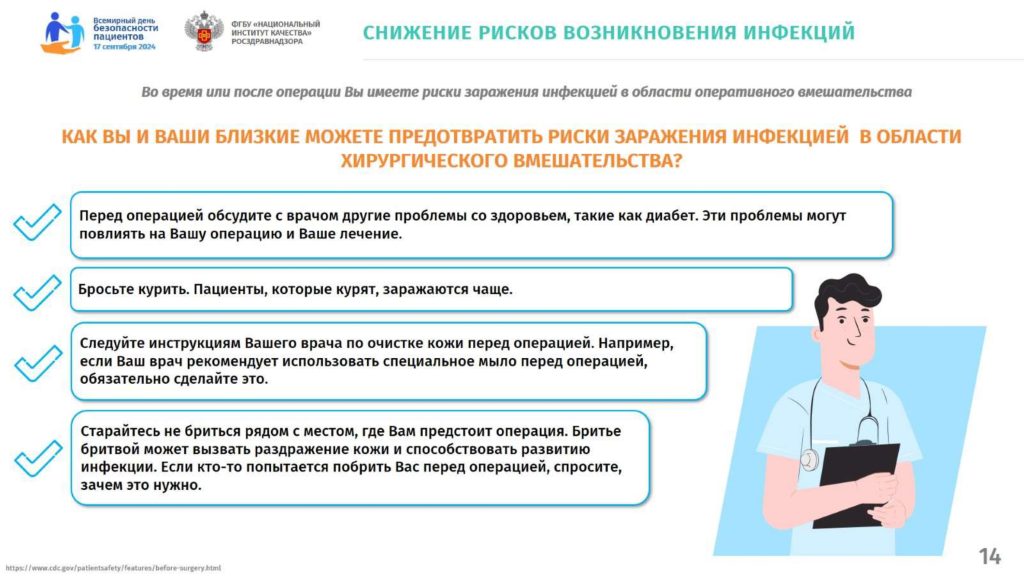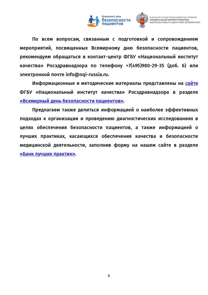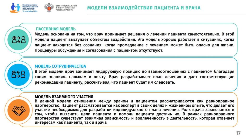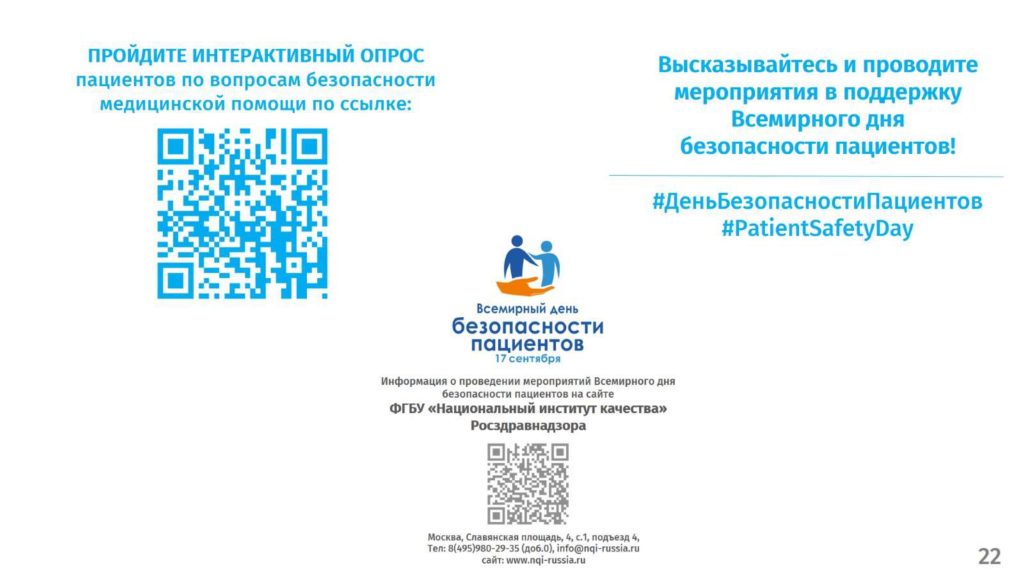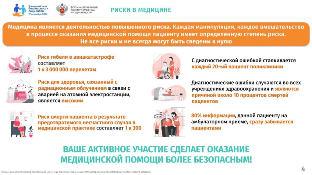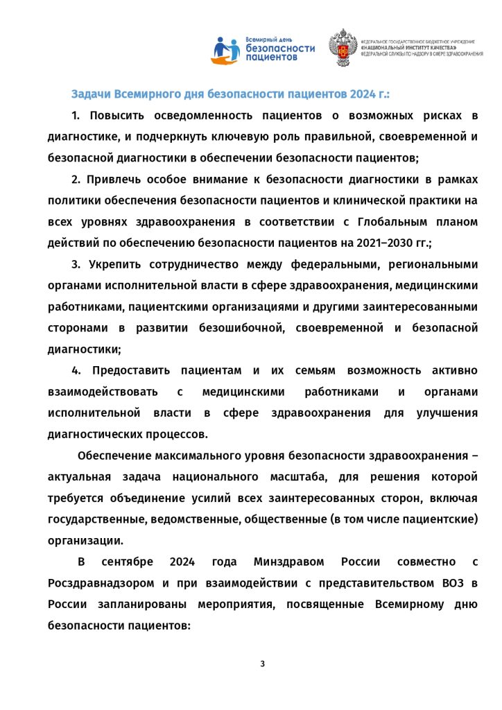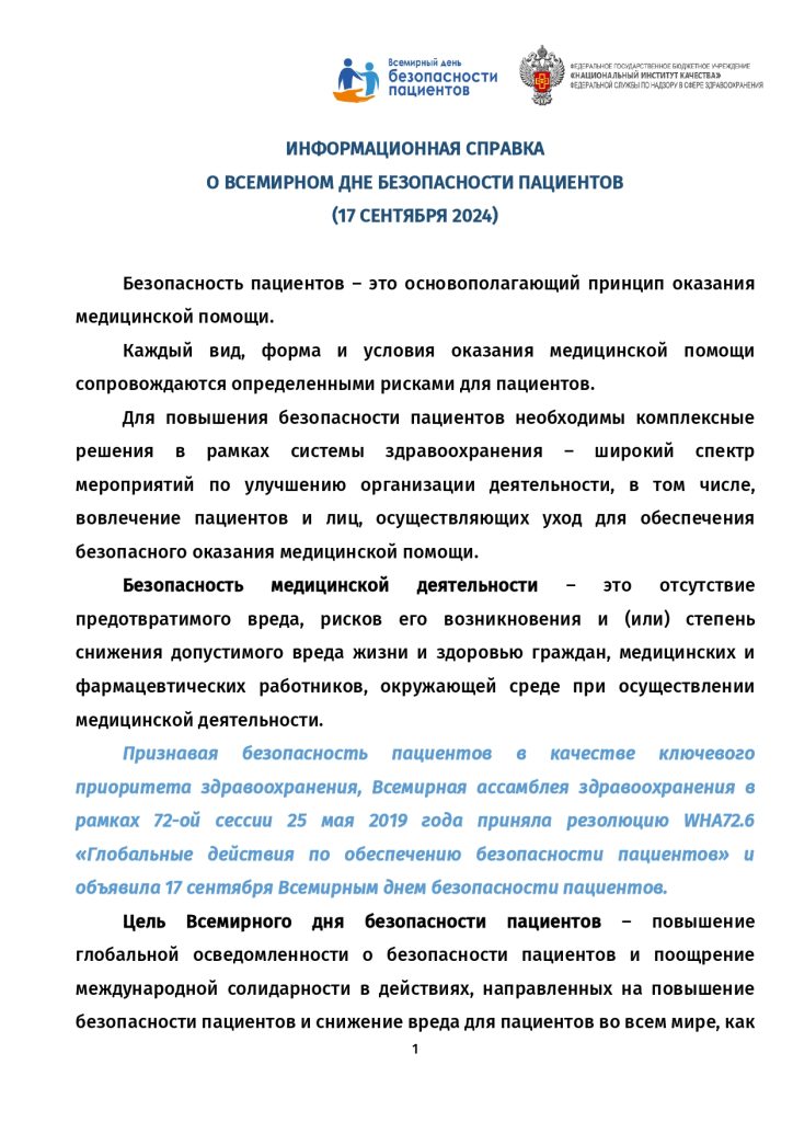 17 сентября 2024 г. Минздравом России совместно с Росздравнадзором и при взаимодействии с представительством ВОЗ в России запланировано проведение мероприятий, посвященных Всемирному дню безопасности пациентов.