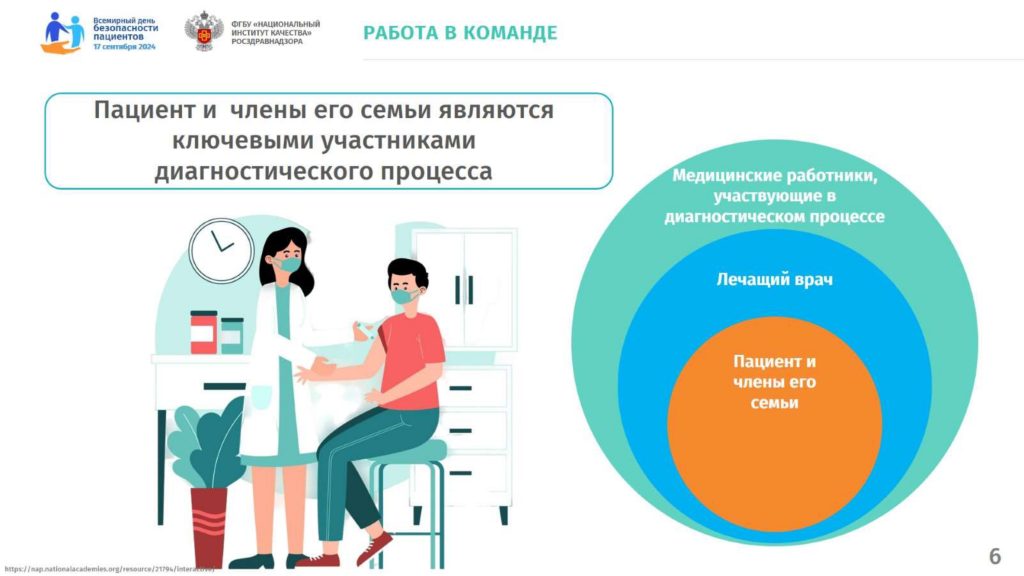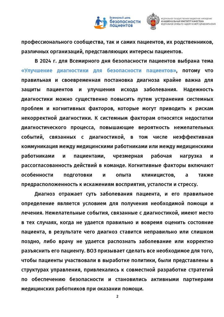 В 2024 г. для Всемирного дня безопасности пациентов выбрана тема «Улучшение диагностики для безопасности пациентов», ведь правильная и своевременная постановка диагноза крайне важна для защиты пациентов и улучшения исхода заболевания. Надежность диагностики можно существенно повысить путем устранения системных проблем и когнитивных факторов, которые могут приводить к диагностическими ошибкам. К системным факторам относятся недостатки организации, повышающие вероятность диагностических ошибок, в том числе неэффективная коммуникация между медицинскими работниками или между медицинскими работниками и пациентами, чрезмерная рабочая нагрузка и рассогласованность действий в команде. Когнитивные факторы включают особенности подготовки и опыта клиницистов, а также предрасположенность к искажениям восприятия, усталости и стрессу. В резолюции WHA72.6 «Глобальные действия по обеспечению безопасности пациентов» и Глобальном плане действий по обеспечению безопасности пациентов на 2021–2030 гг. (на английском языке) подчеркивается необходимость обеспечения безопасности диагностических процессов. Поскольку многие пациенты, скорее всего, в течение своей жизни столкнутся хотя бы с одной диагностической ошибкой, необходимо проделать большую работу по повышению безопасности процессов диагностики.
