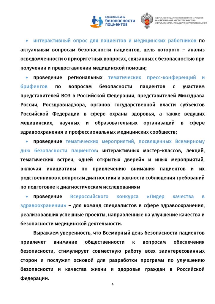 В рамках Всемирного дня безопасности пациентов в Российской Федерации в 2024 году запланированы следующие мероприятия: