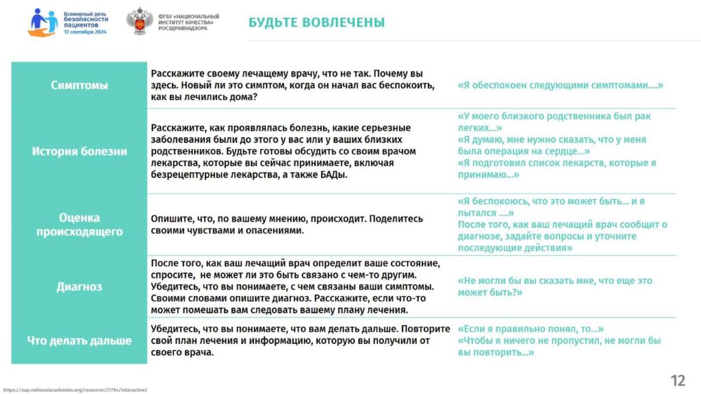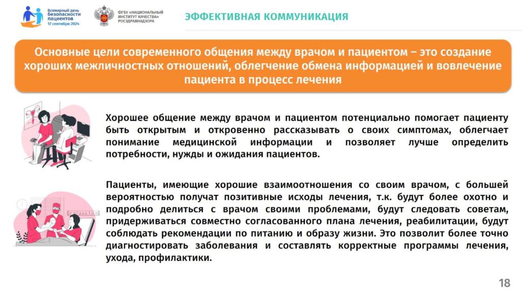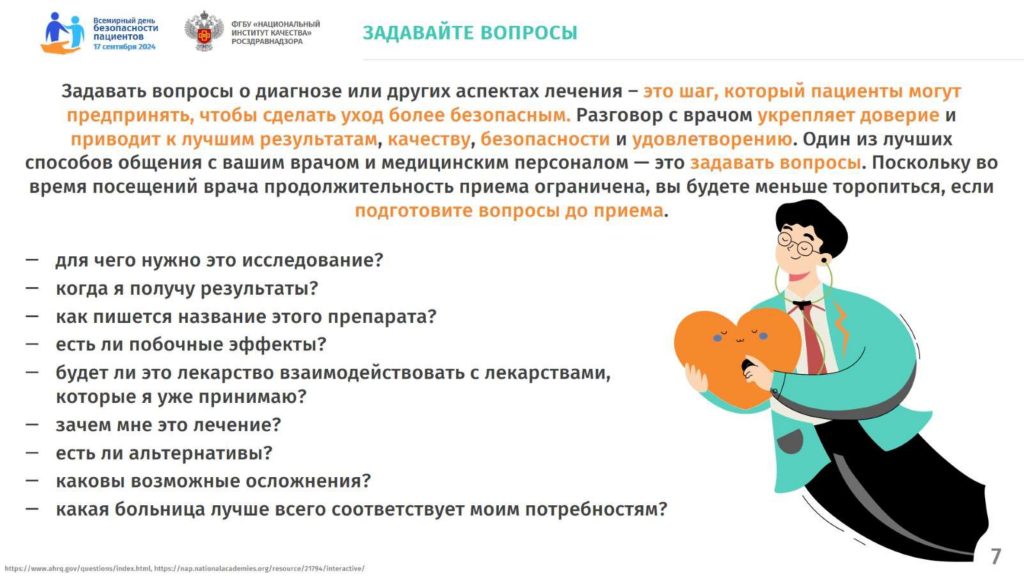 Всемирный день безопасности пациентов служит поводом повысить осведомленность населения и укрепить сотрудничество между пациентами, медицинскими работниками, политиками и лидерами здравоохранения в интересах повышения безопасности получателей медицинской помощи.
