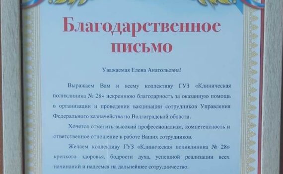 Главному врачу ГУЗ “Клиническая поликлиника № 28” Титовой Елене Анатольевне было вручено благодарственное письмо за оказанную помощь в организации и проведении вакцинации сотрудников Управления Федерального казначейства по Волгоградской области.