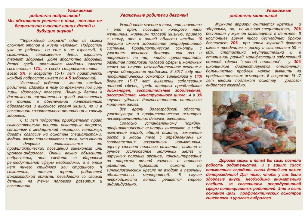 Рекомендуем ознакомиться с информационными материалами, направленными на информирование несовершеннолетних и их законных представителей о необходимости проведения ежегодных профилактических медицинских осмотров, разработанные главными внештатными специалистами Облздрава: детским по профилактической медицине и гинекологом детского и юношеского возраста.