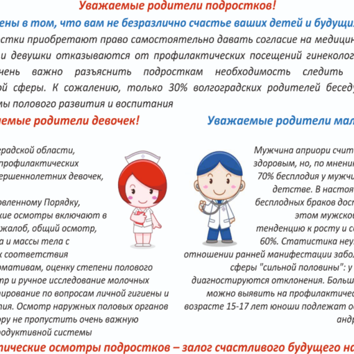 Уважаемые граждане! Рекомендуем ознакомиться с памяткой для родителей “Профилактические осмотры подростков – залог счастливого будущего наших детей”, подготовленной специалистами ГБУЗ “ВОЦМП”.