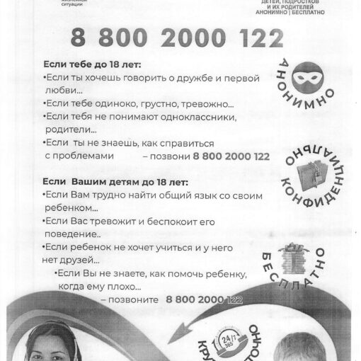 Уважаемые граждане! Напоминаем, что с сентября 2020 года действует детский телефон доверия “Ты не един” с единым общероссийским номером 8-800-2000-122.