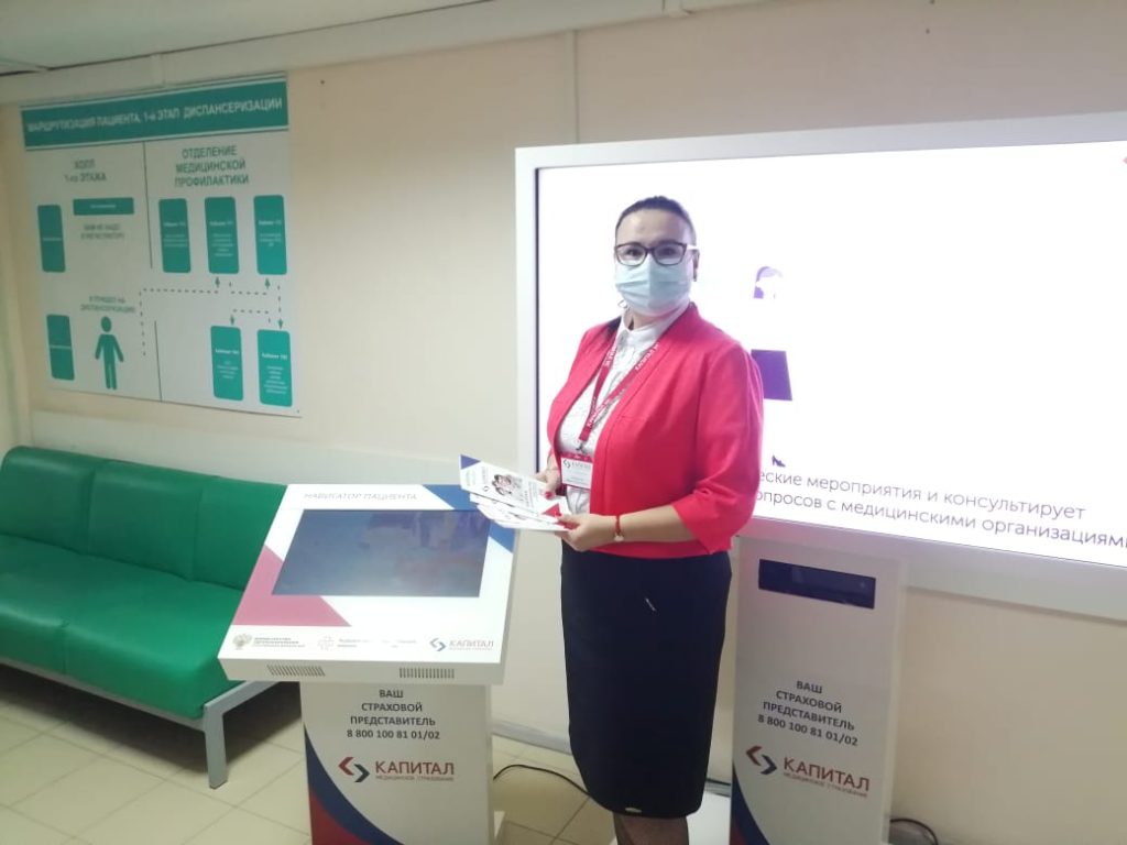 В данный момент информация на сенсорной панели включает в себя три больших раздела: «Школа грамотного пациента», «Страховой представитель рядом» и «Профилактика – здоровье под контролем».