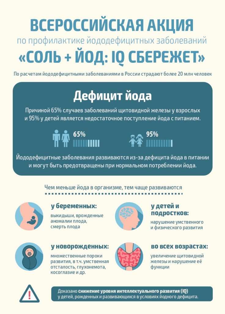 Важность информирования россиян обусловлена чрезвычайно высоким уровнем йододефицита: фактическое среднее потребление йода жителем России составляет 40-80 мкг в день, что в 3 раза меньше установленной нормы, а частота эндемического зоба – наиболее очевидного проявления дефицита йода в питании – в некоторых регионах страны достигает 95 %. Врачи с сожалением констатируют тот факт, что с каждым годом регистрируется все больше случаев кретинизма у новорожденных и младенцев, связанных с внутриутробным дефицитом йода.