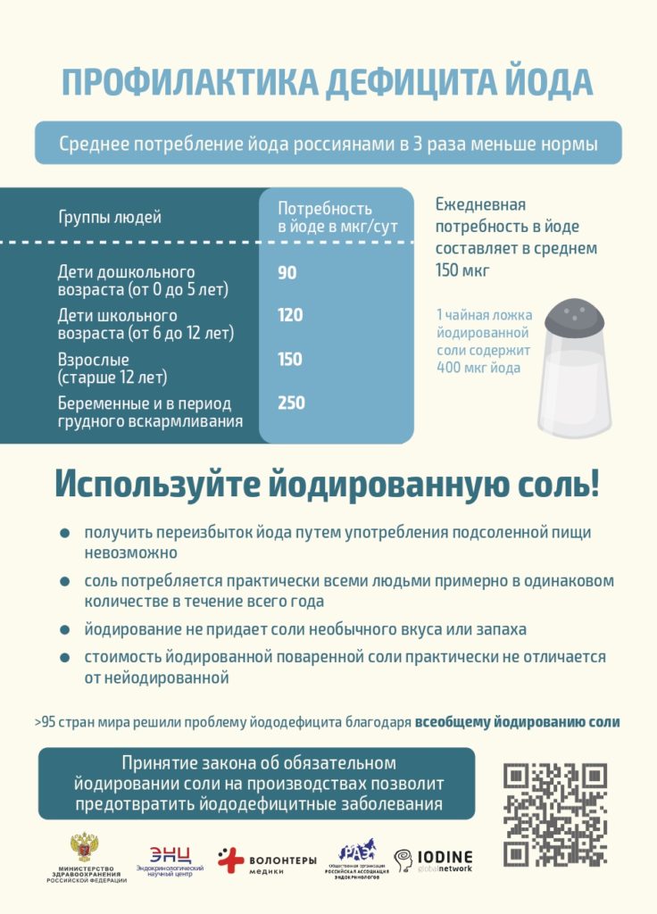 24-26 мая 2019 г. пройдет Всероссийская акция по профилактике йододефицитных заболеваний «Соль + йод IQ сбережет», целью которой является повышение уровня информированности населения по вопросам йододефицитных заболеваний и мерах их предупреждения. Организаторами акции являются Министерство здравоохранения Российской Федерации, ФГБУ «НМИЦ эндокринологии» Минздрава России, Российская Ассоциация Эндокринологов и Всероссийское общественное движение «Волонтеры-медики».