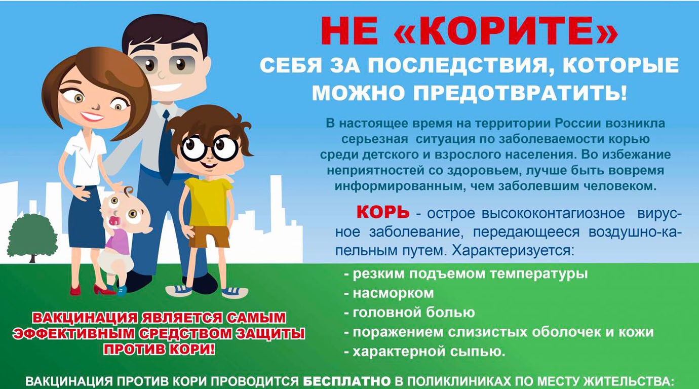 Профилактика. Основной и наиболее эффективный метод защиты — вакцинация. Подлежат вакцинации: Дети от 1 года до 17 лет (включительно), взрослые от 18 до 35 лет (включительно), не болевшие, не привитые, привитые однократно, не имеющие сведений о прививках против кори; взрослые от 36 до 55 лет (включительно), относящиеся к группам риска (работники медицинских и организаций, осуществляющих образовательную деятельность, организаций торговли, транспорта, коммунальной и социальной сферы; лица, работающие вахтовым методом, и сотрудники государственных контрольных органов в пунктах пропуска через государственную границу Российской Федерации), не болевшие, не привитые, привитые однократно, не имеющие сведений о прививках против кори