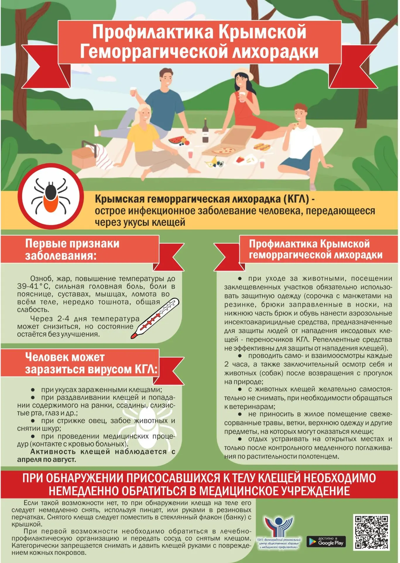 При обнаружении клеща на теле обязательно правильно удалить его самостоятельно или обратиться в ближайшее лечебно-профилактическое учреждение. После удаления клеща необходимо в течение 14 дней наблюдать за своим состоянием здоровья и при малейшем его ухудшении обращаться к врачу.