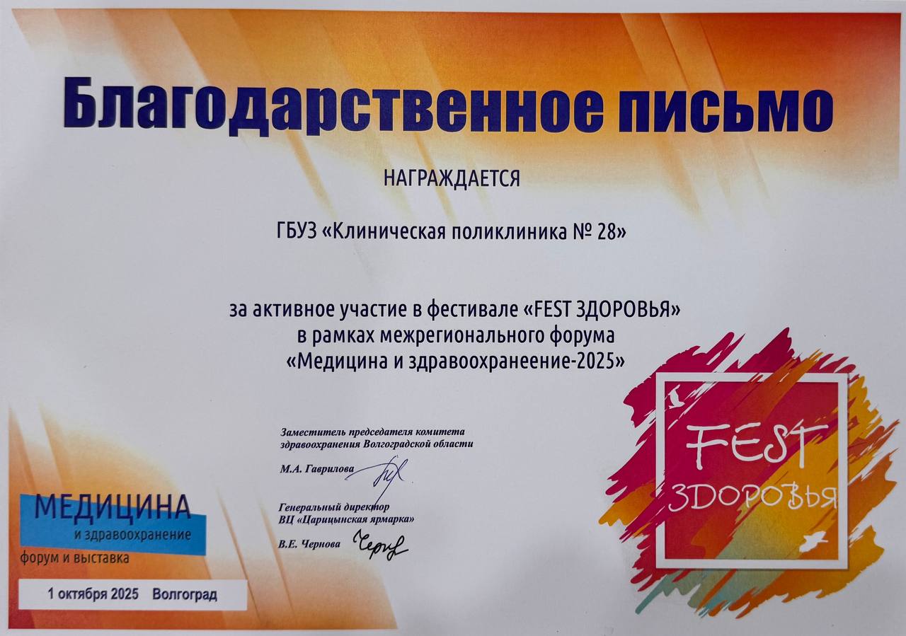 По итогам мероприятия наша поликлиника была отмечена Благодарственным письмом за активное участие в фестивале «Fest Здоровья».