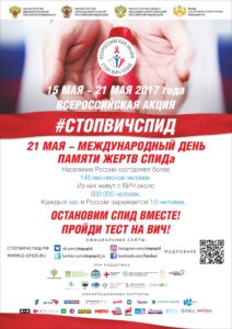 В Российской Федерации 15 мая 2017 года стартует Всероссийская акция «Стоп ВИЧ/СПИД». Акция продлится до 21 мая. Основная цель – привлечение внимания общественности к проблеме распространения ВИЧ-инфекции в нашей стране.